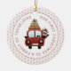 Nosso primeiro Natal como carro-pai com presentes rosa de ouro com fotografia de brilho cerâmica Ornament. A frente apresenta um carro com cervo e presentes e o texto "Nosso Primeiro Natal como uma família de três" e uma borda de flocos de neve rosa dourados e a parte de trás a foto da menina com a mesma borda. Altere a foto e adicione seus detalhes!