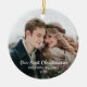 Este ornamento elegante é perfeito para casais recém casados. A design apresenta sua foto de casamento com um roteiro branco moderno para personalizar que diz: "Nosso Primeiro Natal como Sr. + Sra. 20xx. Faz um enfeite de férias único que você vai adorar! Desenhada por Susan Coffey.