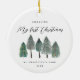 Este ornamento de feriado rústico apresenta a tipografia "meu primeiro Natal como tia" com bonito escrita. Os nomes personalizados e o ano personalizado estão incluídos. No centro estão lindos pinheiros pintados! Um doce presente de feriado para uma tia amada. Compre esta loja para coordenar a camisa!
