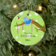 Um fundo verde brilhante com bolinhas brancas acentua este doce pássaro branco sentado num galho de árvore. Personalize adicionando nome e data de nascimento dos bebês conforme desejado.