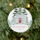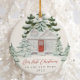 Este belo ornamento de Natal apresenta uma casa festiva pintada, pronta para o Natal, com cobertura de neve e pinheiros de inverno. A tipografia "Nosso primeiro Natal em nossa nova casa" com bonito escrita vermelha é incluída na frente, com o ano personalizado e seu novo endereço de rua em um fundo branco. O verso do ornamento sazonal é o endereço do cheio e o nome do novo proprietário.