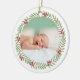 Este elegante ornamento de manutenção de fotos de dois lados apresenta uma foto de recém-nascido do seu bebê enquadrado por uma coroa verde floral de Natal.