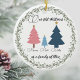 Celebre o primeiro Natal do bebê com este encantador Enfeites de natal de fotografia cerâmica, perfeito para novos pais! Um lado apresenta três árvores festivas em cor-de-rosa e azul, simbolizando mamães, pais e bebês, com a elegante escrita "Nosso Primeiro Natal como uma Família de Três." O verso oferece um quadro circular personalizável para sua foto favorita do seu pequeno e espaço para o ano. Este presente de Natal personalizado é um belo guardião para merecer durante anos.
