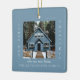 Uma fotografia simples e moderna mantém uma nova decoração de fotografias caseiras para comemorar o seu primeiro Natal na nossa nova casa. O design apresenta um simples design mínimo com um design de fotografia quadrada para mostrar a sua nova fotografia de casa especial. "Nosso primeiro Natal", ano e nome de família é mostrado em uma simples design moderna ao redor da foto. Dois ornamentos fotográficos com uma foto de um lado e uma segunda foto do outro lado do ornamento.