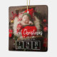 Moderno e elegante Feliz Natal, o primeiro Natal do bebê, um ornamento fotográfico. Fonte escrita à mão. Estatísticas de recém-nascidos, libras LBS, Ounces OZ e Polegadas.