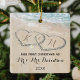 Enfeites de natal temático impressionante da praia tropical apresentando o oceano, uma costa arenosa com dois corações, suas iniciais e um mr & mrs modelo que é fácil de personalizar.