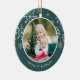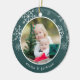 Enfeites de natal de fotos festivas apresenta uma foto favorita em cada lado, emoldurada por flocos de neve brancos em verde caçador de vitrines. Personalize com uma legenda personalizada em cada lado; mostrada com nomes e o ano.
