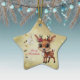 Celebrar a temporada de festas com este ornamento cerâmico de estrela festiva dourada com um cartoon cartoon de floresta cartoon de um bebê lindo veado com flores de poinsettia escondidas na orelha da fada, e Feliz Natal escrito em vermelho. Uma rena perfeita com galhadas por decorar a sua árvore ou como um presente pensativo, esta decoração floral brilhante faz um bem-estar apreciado por anos. Veja a coleção de veados do ForestBabies Xmas para confundir decorações. 🎄 🦌