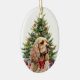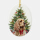 On the front of this Holiday ornament is the image of a buff colored Cocker Spaniel Dog wearing a festive red bow. The dog sits in front of a decorated Holiday tree. On the back, red and green text says MERRY CHRISTMAS", and there are additional text fields for you to customize. Make it say whatever you'd like!