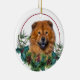 Na frente deste ornamento de Feriado está uma imagem de um Cachorro de Chow Vermelho laranja, espreitando de uma tosse sagrada e verde. Morangos vermelhos e cones de pínus decoram os sprigs de pinho e sprigs de pinho. A imagem é colocada em um círculo branco dentro de um círculo fino de linha vermelha. A parte de trás do ornamento tem a mesma coroa verde e círculo com seu texto personalizado em vermelho.