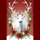 Uma ilustração impressionante de uma rena branca, majestamente envenenada no centro. Suas grandes galhadas se espalharam, enfeitadas com um arranjo festivo de rosas vermelhas e flores brancas, criando um contraste vibrante contra um fundo vermelho profundo.