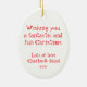 Decoração personalizável de rena alegre na neve profunda para ajudar a celebrar o Natal com um sorriso. O texto no verso pode ser personalizado com suas próprias palavras e nomes. Arte e design por Sarah Trett.