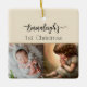 Penteado bonito, pequeno, castanho, pintura de anjo rezando com bochechas rosadas, vestida de vestido branco e um halo luminoso radiante. As modelos de texto estão acima para o nome e o ano do Natal, juntamente com balanços personalizáveis para brincar também.