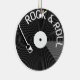 Uma ilustração a preto e branco de um registro de vinilo num leitor de discos girável. O disco tem rock and roll escrito nele. Um design divertido para pessoas que gostam de rock & roll music, rock n'roll dancing e o som de excelente que os leitores retrorreflectores podem produzir.