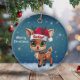 Rudolf reindeer, red nose deer with antlers. Celebrate the holiday season with this blue festive round ceramic ornament featuring an endearing icy winter woodland animal forest wildlife. Unique cartoon graphic of a cute doe wearing a Santa hat, and Merry Christmas written in white. Perfect for decorating your Xmas tree or as a thoughtful gift, this whimsical character decor makes a cherished keepsake for years to come. Customize by changing the text, the font, the font color, or remove the text. You can even transfer this baby fawn lover design onto other products. Enjoy this design your way! 🎄🦌