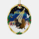 Dois Dachshund observam três homens sábios se dirigindo em direção a Belém como uma pomba de paz pairando à luz das estrelas.