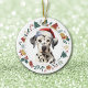 Aqui está um lindo ornamento personalizado para qualquer um que ama um cão Dalmático. A frente tem uma aquarela Dal vestindo um chapéu de Papai Noel vermelho e branco. A imagem é enquadrada dentro de uma coroa circular colorida composta por várias imagens de Férias, incluindo um boneco de neve, sinos, cana doce, estocagem, Holly e muito mais! A parte de trás do ornamento tem a mesma imagem de coroa com seu texto personalizado em verde e vermelho.