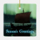 Uma imagem ligeiramente estilizada de um navio de longa distância Viking navegando à noite sob as Luzes do Norte ali um casal de icebergs; a maioria da tripulação está dormindo. "Saudações da Estação" aparece em azul e branco brilhantes. Esta é uma versão desbotada ou vintage da imagem original mais clara que também está disponível.