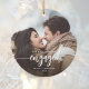 Comemore o seu noivado com este belo ornamento moderno do keepsasaame. O texto branco lê "Nosso primeiro Natal engajado", com a palavra "engajado" em um roteiro elegante de caligrafia com traços decorativos antes e depois. Substitua a imagem de exemplo por sua foto favorita e adicione seus nomes e o ano. Um filtro de gradiente preto ajuda a fazer o pop de texto.