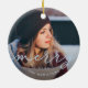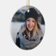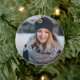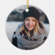 O ornamento de feriado simples e elegante apresenta uma foto em cada lado com "feliz" sobreposta em caracteres azuis de gelo vitorioso. Personalize com o ano abaixo.