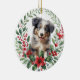 Este ornamento bonito de Feriado apresenta um retrato de aquarela de um adorável cachorrinho azul de Cachorro Australiano Shepherd. O filhote está enrolado com uma coroa de bagas ocas e vermelhas com uma poinsettia vermelha florescendo no fundo. A parte de trás do ornamento tem a mesma coroa, com dois campos de texto para personalizar.
