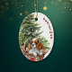Na frente deste ornamento de Férias está a imagem de um filhote bonito de Cavalier King Charles Spaniel deitado na sua cama de vime em frente a uma árvore de Natal decorada. O texto vermelho curvo no lado diz "NATAL". No verso, o texto vermelho e verde diz MERRY CHRISTMAS", e há campos de texto adicionais para você personalizar o que quiser.
