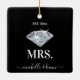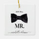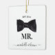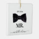 Um design elegante de casamento em preto e branco, perfeito para os recém-casados ou para a comitiva da noiva. O enfeite é projetado em preto e branco com uma gravata borboleta preta elegante para o "Sr." e um lindo diamante cintilante para a "Sra.". A data estabelecida está localizada no topo, que pode ser personalizada para a data do seu casamento ou uma data memorável em suas vidas. Uma fonte de caligrafia elegante é usada para os nomes da noiva e do noivo localizados na parte inferior. Personalize o texto e faça-o seu.