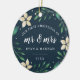 Celebre seu primeiro Natal como um casal casado com este adorno charmoso e festivo. Design apresenta "o nosso primeiro Natal como Sr. & Sra." e o ano em letras brancas, cercado por flores de poinsettia de marfim e folhagem verde de férias em um rico fundo azul marinho. Adicione uma foto ao verso com embelezamentos botânicos de feriado correspondentes. Projetado para coordenar com nossa coleção de feriados Bright Boughs.