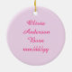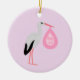 Este ornamento apresenta uma imagem gráfica de uma bela Stork branca com penas pretas de cauda pretas segurando-as num pacote de cobertores rosa claro. Há um texto cor-de-rosa no pacote que diz "Baby Girl". Esta design é perfeita para celebrar uma menina. Há um texto personalizado para que você possa incluir o nome da sua menina e a data de nascimento dela. Este ornamento faria um lindo anúncio de nascimento ou presente para uma nova mãe, assim como um lindo presente de Natal.