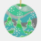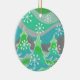Uma paisagem de inverno moderna e estilizada com pinheiros foscos e flocos de neve espumantes. Um ornamento cerâmico com uma cinza verde, azul, prata e branco personalizável para você personalizar com seu próprio texto, imagens e ideias. Imagem criada usando um desenho a lápis colorido melhorado digitalmente.