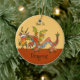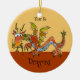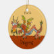 Uma ilustração de dragão de desenho animado baleado nesta ornamentação está em castanhos, dourados, laranja, com um azul pálido embaixo. Na parte de trás está um dragão verde roxo. Você pode editar texto para criar seu próprio presente personalizado. Precisa de ajuda, envie um email para lilly@lillyarts.com