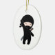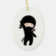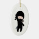 Ninja feliz de desenho animado vestido de preto com braço levantado em ondas. A espada tradicional japonesa katana pode ser vista em cima do ombro.