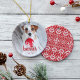 Dê a seu amigo peludo um lugar especial na árvore este Natal com nosso ornamento de fotos de animais de estimação tipo festivo. Design apresenta a sua foto favorita de cão ou gato com o nome de seu animal de estimação sobreposto em letras vermelhas no roteiro de caligrafia. Personalize com o ano abaixo. Ornament inverte para revelar um padrão festivo de suéter nórdico em vermelho e branco.