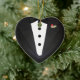Enfeite cerâmico em forma de coração com imagem de um smoking com gravata preta de arco e bud boutonnière de rosa vermelha. Veja o ornamento de homólogo feminino "Todos Vestidos 1". Veja toda a coleção do Ornamento de Cancan nos TOUCHES ESPECIAIS | Seção Favoritos para festas.