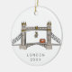 Um ornamento de árvore de Natal Whimsical que apresenta uma ilustração da Torre Bridge com uma névoa e um ônibus de dois andares como um toque especial. Vire-o e adicione sua foto favorita de sua viagem a Londres como um momento especial!