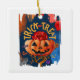Este ornamento vibrante apresenta a frase "Trick or Tratat" com um jack-o-lanterno assustador tocado por uma rosa vermelha impressionante, colocado sobre um fundo corajoso e colorido. Uma mistura perfeita de loucos e elegantes — ideal para amantes do Halloween, festividades de outono, estética gótica e vibrações de época assustadora.
