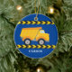 Legal Enfeites de natal de caminhão de lixo para uma criança que ama veículos de construção amarelos a azul. Um presente divertido para um menino que ama carros e caminhões. Personalize com o nome do seu filho sob a fita de precaução preto e amarelo.