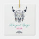 O ornamento Saudações desta Estação apresenta um crânio tribal boêmico decorado com flores coloridas, penas e turquesa e texto rosa. *