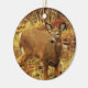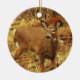 Este ornamento apresenta um delicado veado de cauda branca e marrom pairando na grama de um campo aberto. Ela parou e virou a cabeça porque ouviu um barulho. As orelhas grandes dela estão alertas. O rosto tem marcas brancas em volta dos olhos e nariz. Ela está cercada por cores do outono de vermelho, amarelo, verde, laranja e ouro.