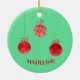 Um ornamento de fotos de crianças bonitinhas do Macaco de Natal. O nome é facilmente substituído por seu próprio para fazer seu próprio presente personalizado de ornamento. Na parte de trás estão as bolas de Natal sobre fundo verde.