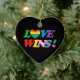 Slogan do "vitórias amor!" em letras do arco-íris no Natal preto, ornamento coração-dado forma.