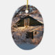 O nascer do sol da manhã cedo brilha sobre uma nova cobertura de neve que cobre os campos e o celeiro.