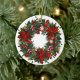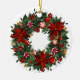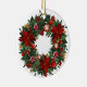 Uma ilustração de arte digital de um Enfeites de natal, com um design de coroa. A coroa é composta por ramos verdes de pinheiros, poinsetos vermelhos, bagas vermelhas, morangos ouros e doces listrados vermelhos e brancos. O ornamento é redondo e branco, com uma corda de ouro no topo para pendurar. O fundo é branco puro. O estilo lembra as decorações clássicas de Natal, com uma reviravolta da arte digital moderna. A paleta de cores é dominada por vermelhos, verdes e dourados, criando uma atmosfera festiva e quente.