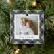 Um adorável ornamento fotográfico de dupla face mostrando uma foto favorita em cada lado, em um fundo de xadrez de búfalo preto e cinza. Personalize com uma legenda personalizada na frente em letra manuscrita e adicione o ano no verso.