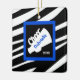 Este é um Enfeites de natal de tendências para esse cheerleader na sua vida! Ele tem um fundo de impressão zebra preto e branco com um quadrado azul brilhante. No centro há um fundo preto com um megafone branco que tem a palavra "Cheer" na diagonal. Personalize com seu nome no centro do megafone e pode adicionar ano também. Veja os muitos outros designs e cores nesta linha. Mantenha essa vigilância por muitos, muitos anos! ©JW Ilustrações