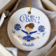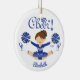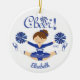 Ornamento do Cheerleader Blunette Branco e Azul. Fácil de personalizar com seu nome e data. Visite nosso compro para ver este ornamento em uma grande variedade de cores e cores de cabelo escolares
