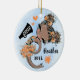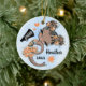 Enfeite de árvore de Natal bonitinho, Na moda e giro. Cores da equipe laranja. Apresentando uma cheerleader de pele escura com design de cabelo castanho/preto e fundo azul de cor aquosa. Mais cores de equipe, assim como cabelo e cores de pele disponíveis no meu compro. Personalize com seu nome e ano. Dons de excelente e guardar para Cheerleaderes, Equipes de Animação e Treinadores.