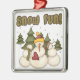 O ornamento de manutenção do Snow Fund apresenta três adoráveis bonitos bonitos homens de neve e árvores verdes e texto que lê "Snow Fun!".