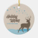 Este moderno e minimalista ornamento de árvore de férias sem fotos trará um pouco de natureza desajeitada aos seus entes queridos! Mostra uma bela e simples design de cena de inverno, apresentando uma rena com galhadas, neve coberta de chão e uma tonelada de estrelas bonitinhas no céu. Um roteiro na moda moderno escreve "Desejos Feriados", o que o torna inclusivo a todas as crenças. Você também pode adicionar seu nome ou nome de família sob ele, para obter mais personalizações. A parte de trás do ornamento lembra o design estrelado da frente. Uma perfeita anfitriã e presente familiar para esta época de Férias!