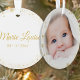 Recém-nascido Baby Photo Ornament, com sua foto favorita do seu recém-nascido na frente com uma camada de fotos de gradiente suave na borda com flocos de neve de ouro pequeno. No verso você personaliza o nome do bebê e a data de nascimento, um nome delicado para um novo começo e perfeito para novos pais e avós orgulhosos.